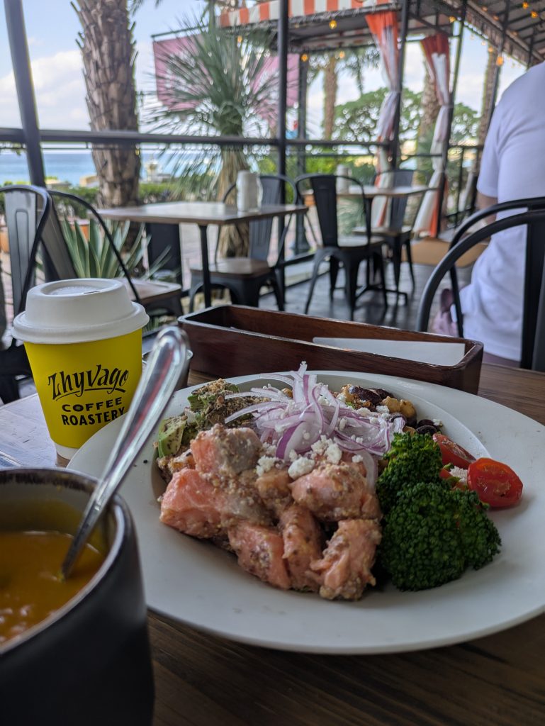 こちらもZHYVAGO COFFEEの系列店です。アメリカ西海岸をイメージした食事メニュー、朝食メニュー、ビーガン メニューを提供するおしゃれな店。海を望むテラス席があり、テラス席は犬同伴OK!